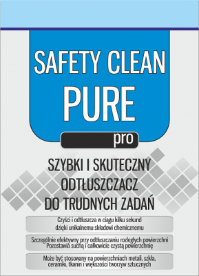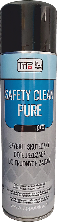 PRO SAFETY CLEAN PURE to skuteczny i bardzo szybko działający środek odtłuszczający w aerozolu. Jego unikalny skład chemiczny, daje szerokie możliwości usuwania rozległych zabrudzeń takich jak: oleje, smary, kleje, żywice, bituminy itp., z powierzchni metali, szkła, ceramiki, tkanin oraz większości tworzyw sztucznych (zaleca się wykonanie próby). PRO SAFETY CLEAN PURE nie pozostawia żadnych plam i smug podczas czyszczenia i zmywania powierzchni. Odparowuje całkowicie i szybko.